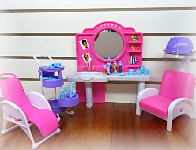 Glorie Kadeřnický salon obsahuje kadeřnickou toaletku se zrcadlem, umyvadlem a odkládací plochou o rozměrech cca 25 cm X 8 cm X 27 cm. Kadeřnické křeslo cca 8 cm X 13 cm, kadeřnické křeslo se sušákem na vlasy o výšce cca 26 cm - není funkční, vozík s přihrádkami a spoustou doplňků pro kadeřnice - hřebínky, kartáče, lahvičky.