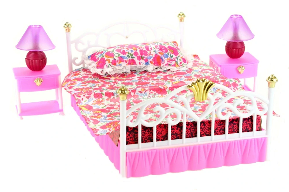 Glorie Ložnice obsahuje plastovou postel o rozměrech cca 20 cm X 32 cm X 13 cm s přehozem přes postel a polštářkem pro panenku.