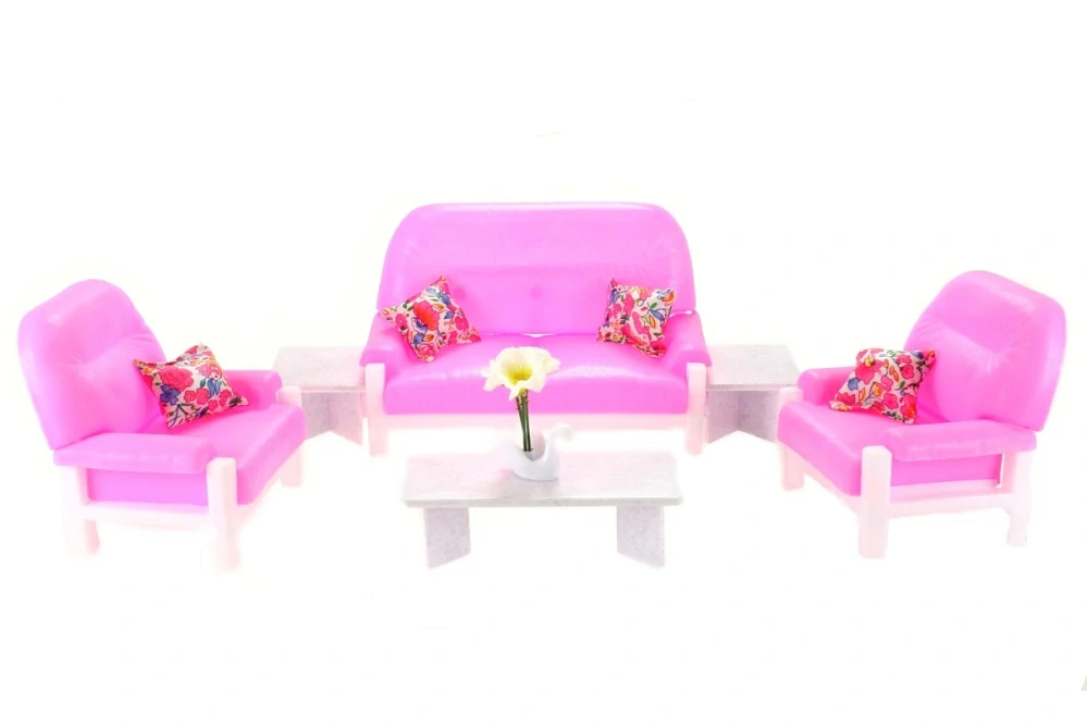 Glorie Obývák obsahuje plastový gauč pro panenky o rozměrech cca 22 cm x 11 cm x 13 cm, 2 plastová křesla o rozměrech cca 13,5 cm x 11 cm x 13 cm, plastový stolek cca 7,5 cm x 15 cm x 5 cm s doplňkem na stolek - plastová labuť s květy, 2 plastové taburety cca 7,5 cm x 4 cm.