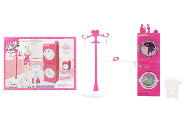 Glorie prádelna pro panenky. Balení obsahuje pračku, sušičku, věšák, žehlící prkno, koš na prádlo a ramínka.