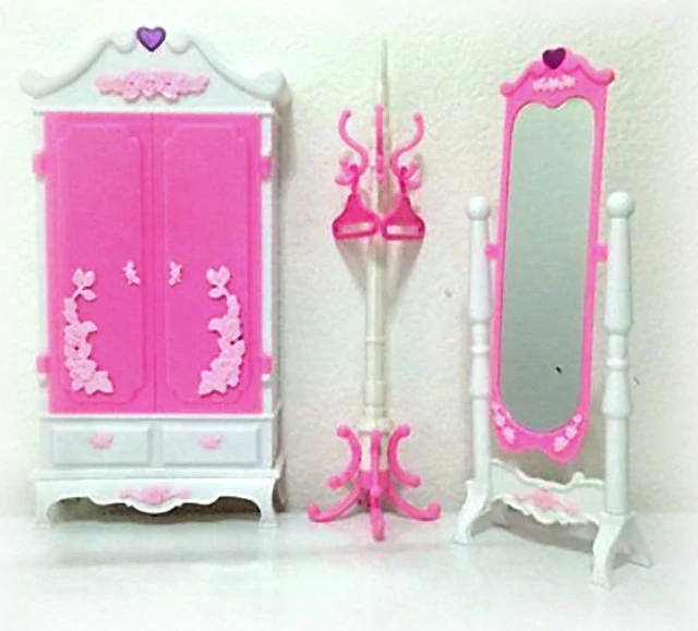Nábytek pro panenky typu Barbie, Steffi a pod. Glorie sada šatna a zrcadlo obsahuje šatní skříň s otvíracími dveřmi, uvnitř ilustrace šatníku, o rozměrech 30 x 15,5 x 5,5 cm, velké stojací zrcadlo o rozměrech 10,5 x 27 x 5 cm a stojací věšák s dvěma ramínky.